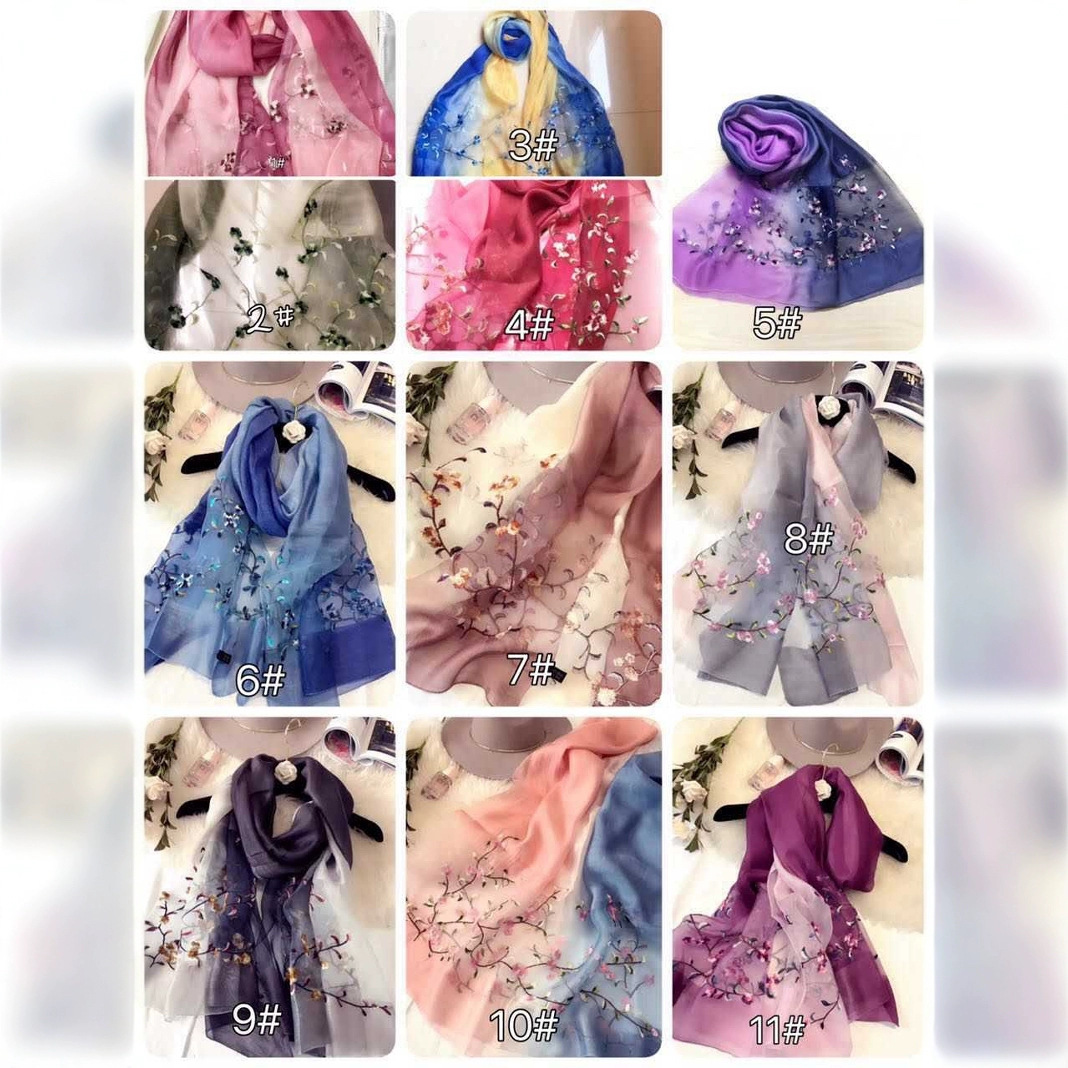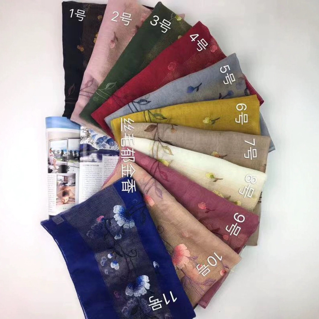 高档真丝羊毛刺绣丝巾批发 渐变色桑蚕丝绣花头巾丝毛围巾