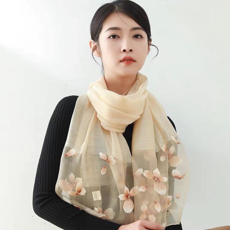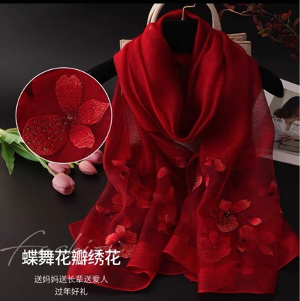 高端新款真丝羊毛丝巾桑蚕丝围巾郁金香刺绣绣花搭配旗袍披肩秋冬