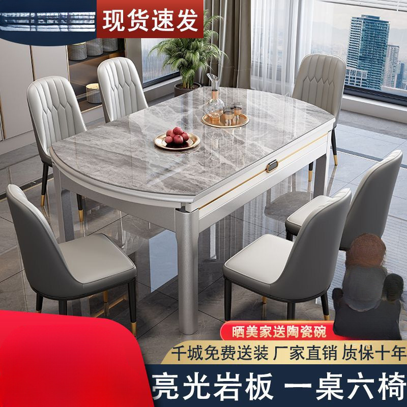 意式亮面岩板餐桌椅组合桌子椅子一套现代简约可伸缩折叠实木圆桌