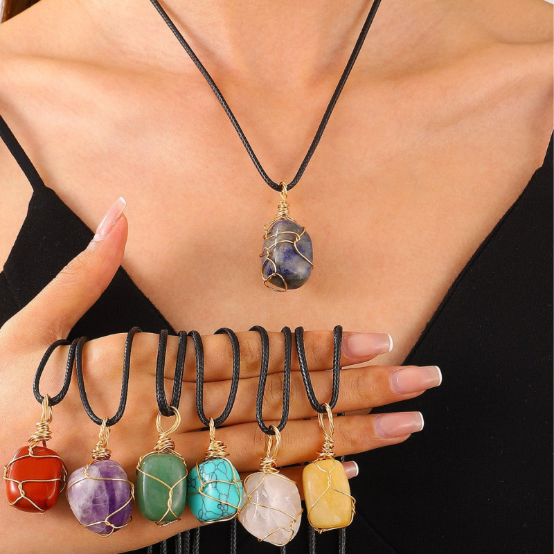 跨境天然石头编织网兜项链吊坠可调节伸缩手工网托复古绳紫晶原石