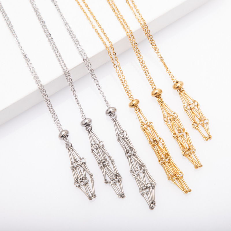 跨境可换水晶原石网兜编织不锈钢网兜项链竹节项链吊坠毛衣链调节