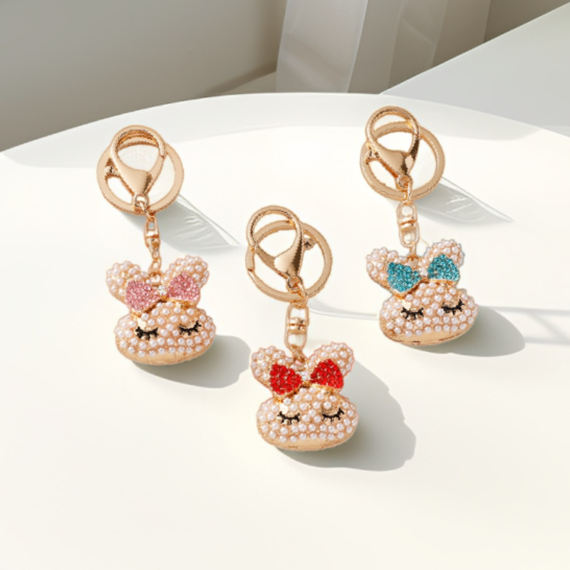 可爱蝴蝶结珍珠兔子头卡通钥匙扣女合金动物钥匙圈汽车包包挂饰品