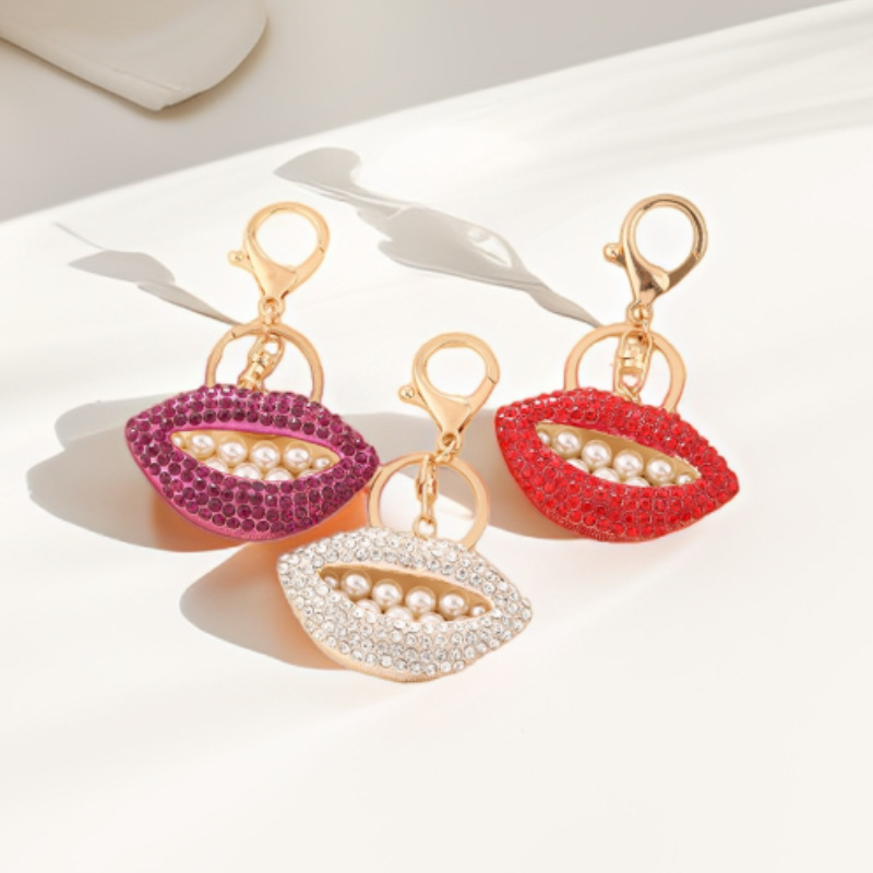跨境创意珍珠嘴唇汽车钥匙扣女合金镶钻红唇钥匙圈汽车包包挂饰品