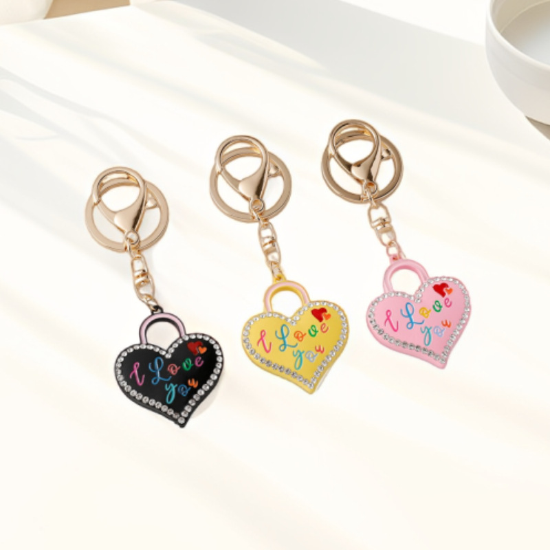 跨境创意珐琅爱心锁情侣钥匙扣镶钻桃心锁金属钥匙圈汽车包包挂件