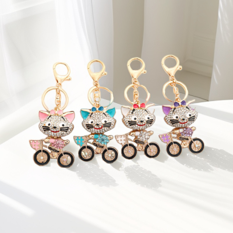 可爱镶钻骑自行车猫咪卡通钥匙扣动物吊坠金属钥匙圈汽车包包挂件