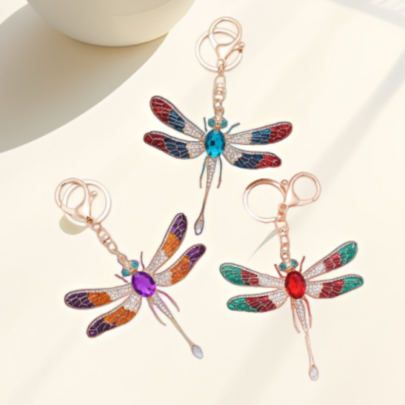 跨境时尚彩色蜻蜓汽车钥匙扣合金镶钻昆虫吊坠钥匙圈汽车包包挂件