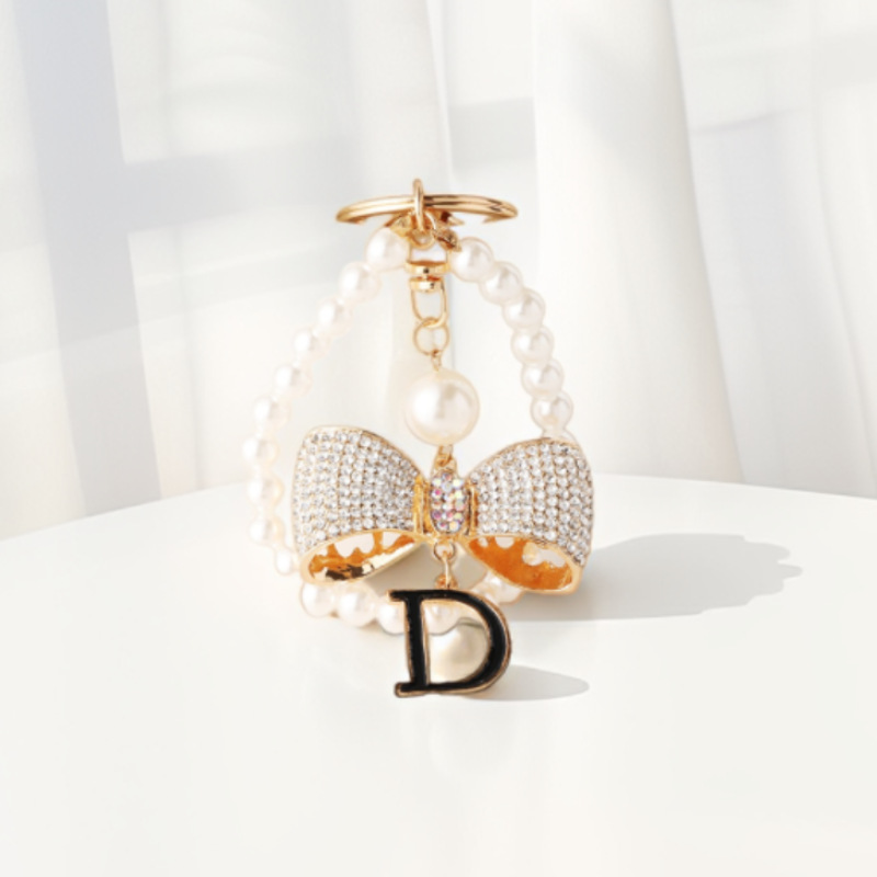 韩版创意珍珠字母D汽车钥匙扣镶钻蝴蝶结金属钥匙链汽车包包挂件