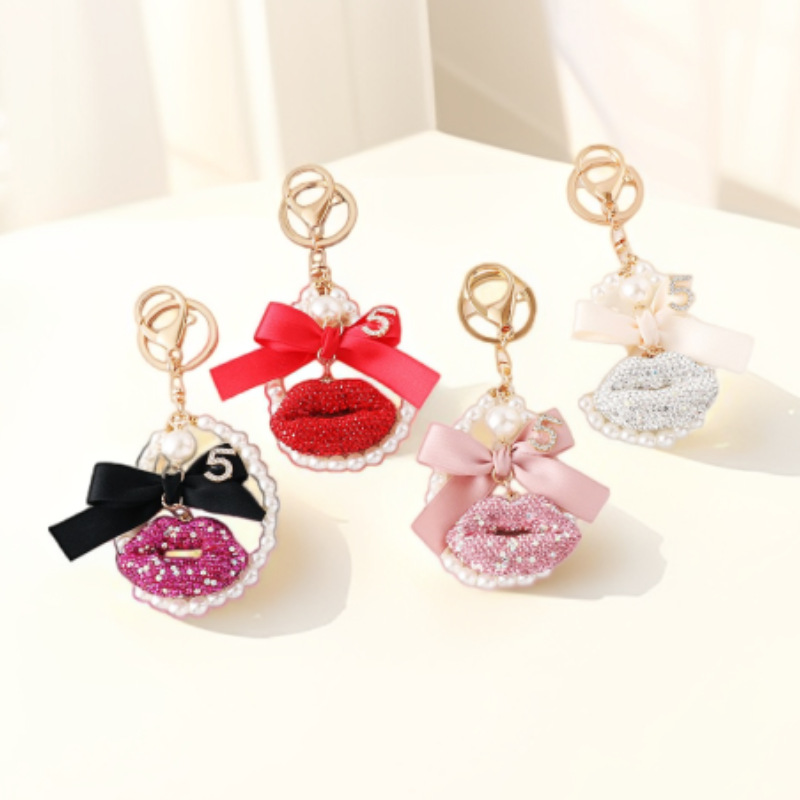 韩版小香风蝴蝶结镶钻红唇汽车钥匙扣女珍珠钥匙链汽车包包挂饰品