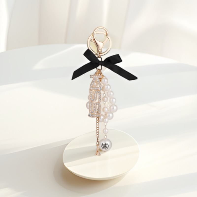 法式小香风蝴蝶结珍珠汽车钥匙扣合金镶钻KISS钥匙圈汽车包包挂件