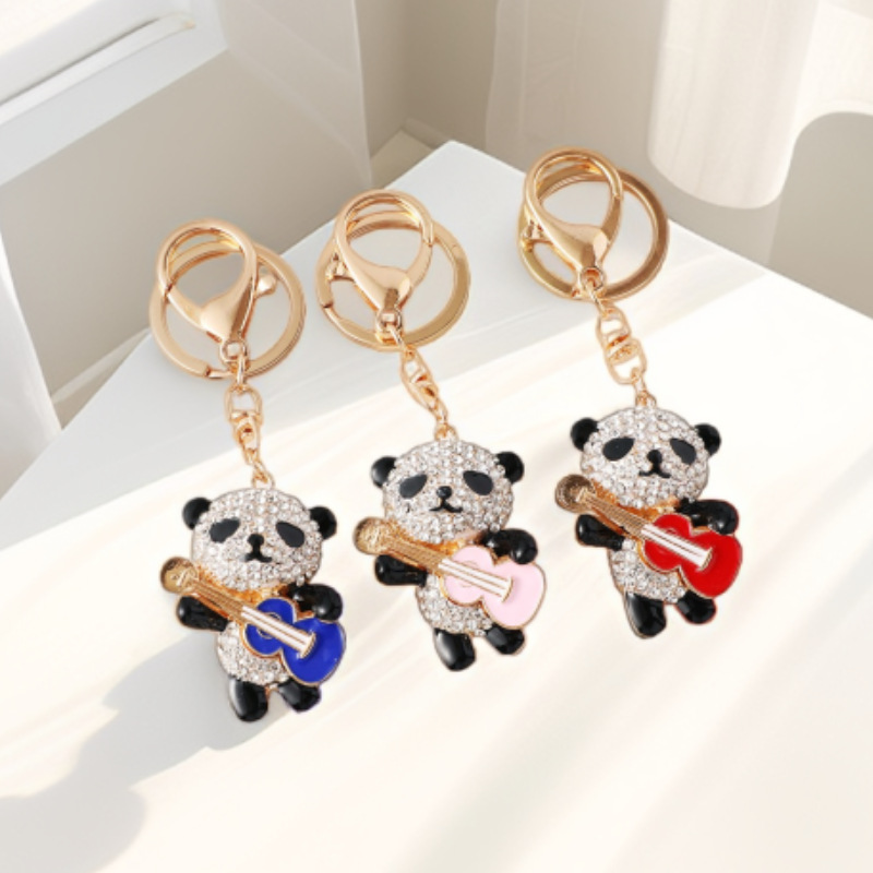可爱弹吉他镶钻熊猫卡通钥匙扣合金动物金属钥匙圈汽车包包挂饰品