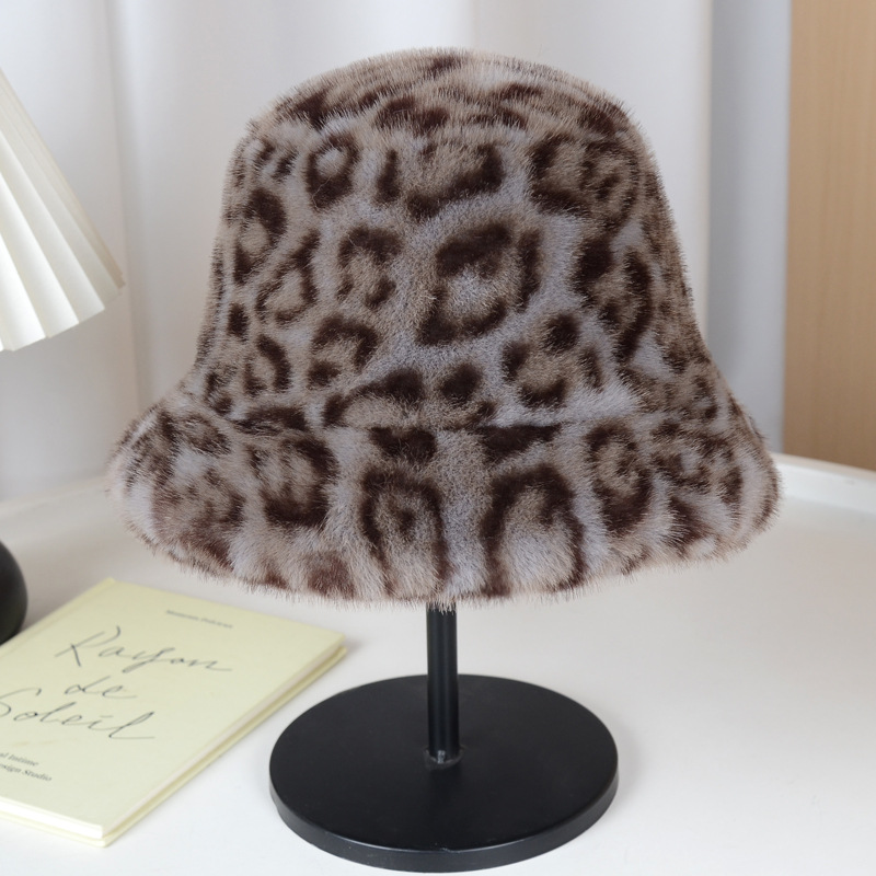 韩版仿狐狸毛豹纹渔夫帽秋冬毛茸茸长毛护耳盆帽潮流氛围感毛绒帽