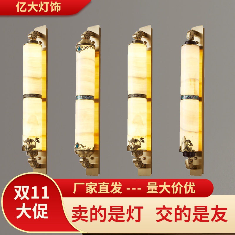 新中式全铜玉石壁灯中国风客厅背景墙卧室床头楼梯长条形云石灯具