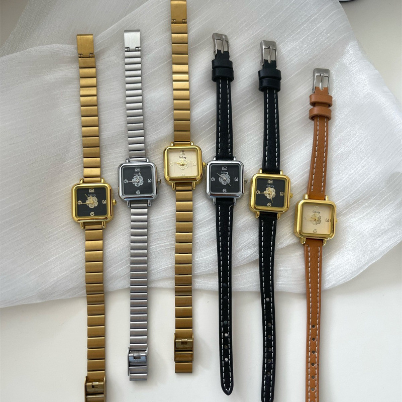 复古山茶花方块小巧气质手表女中古轻奢高颜值指针石英表直播热卖