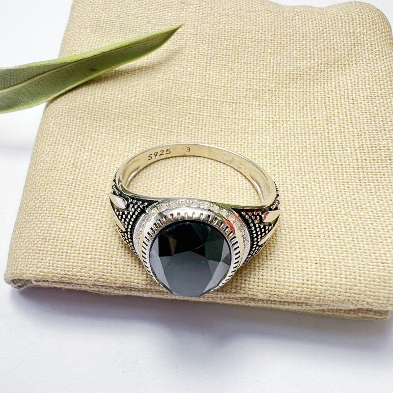 S925纯银日韩流行宽版大气古宝石高级设计戒指男款饰品复古指环