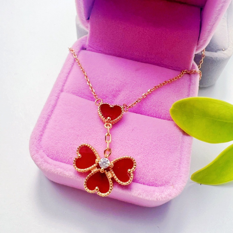 实拍玫瑰金四叶四心爱心吊坠项链女红玛瑙个性简约小众设计锁骨链