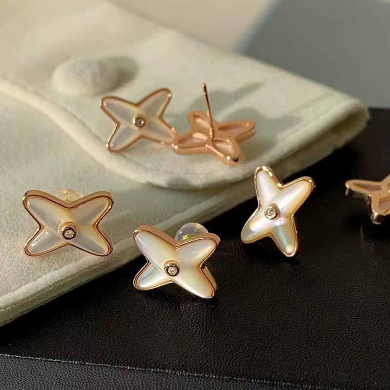 实拍S925纯银精工幸运四叶草蝴蝶白贝母耳钉女纯银厚镀18k玫瑰金