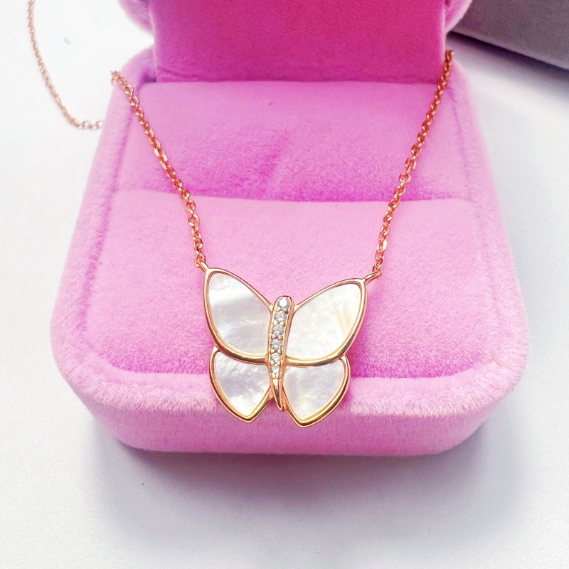 实拍欧美爆款四叶草情侣礼物大蝴蝶项链女玫瑰金轻奢白贝母灰吊坠