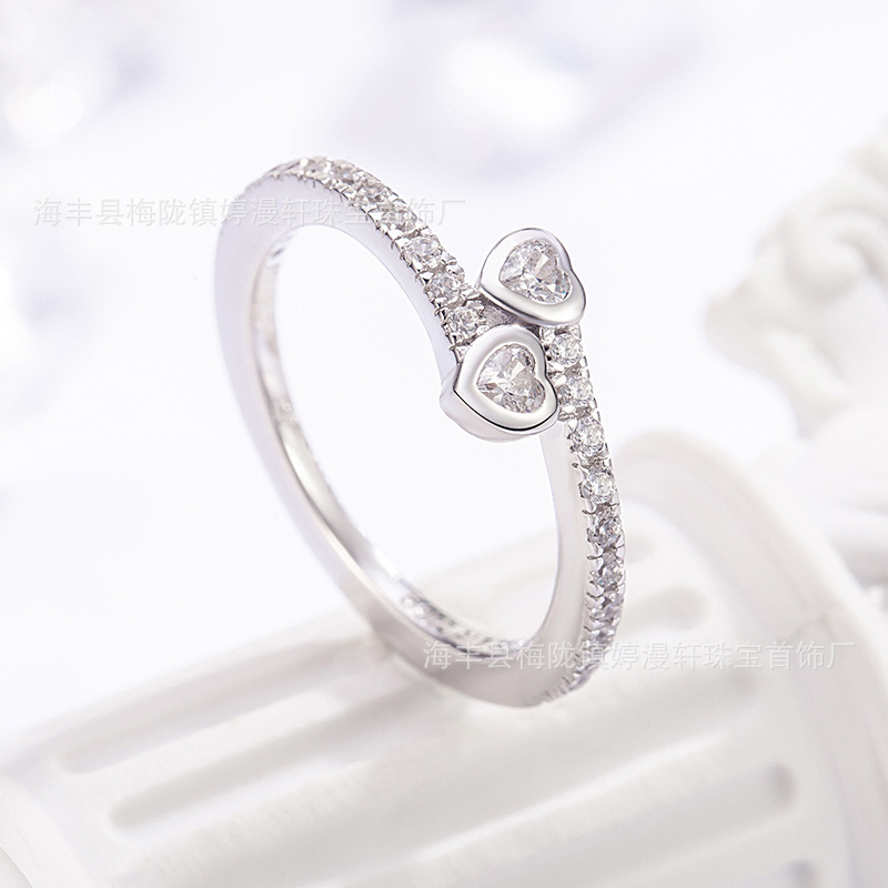 新品S925纯银双爱心满钻高级设计戒指送女友闺蜜礼物时尚个性甜美