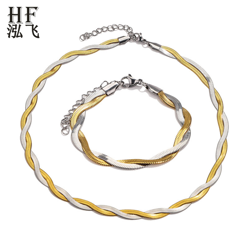外贸新款时尚轻奢风不锈钢蛇骨项链手链18K金钛钢刀片链首饰套装