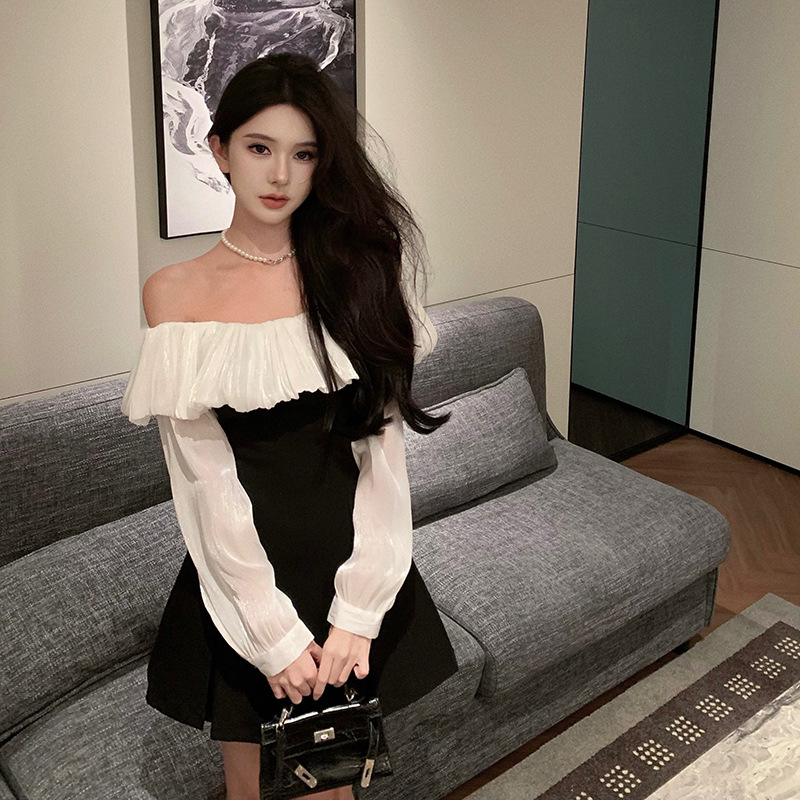 爱依轩 小香风千金一字肩长袖连衣裙女 名媛气质高级感生日小礼服