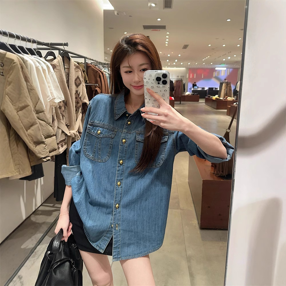 爱依轩 复古流行叠穿牛仔衬衫女春季新款衬衣设计感小众上衣