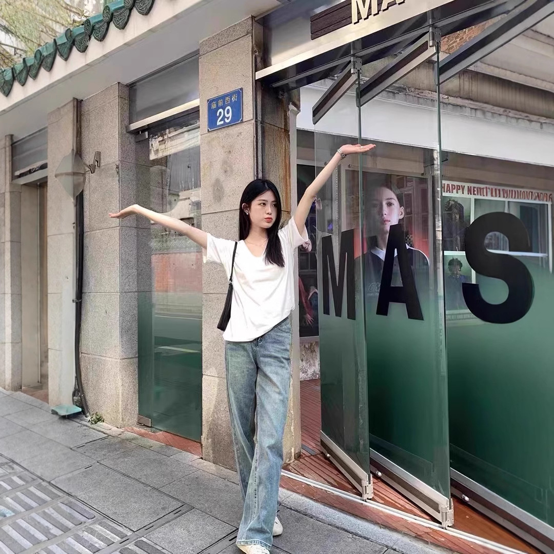 纯色v领正肩宽松百搭显瘦短袖女2025新款爆款夏装减龄休闲T恤上衣