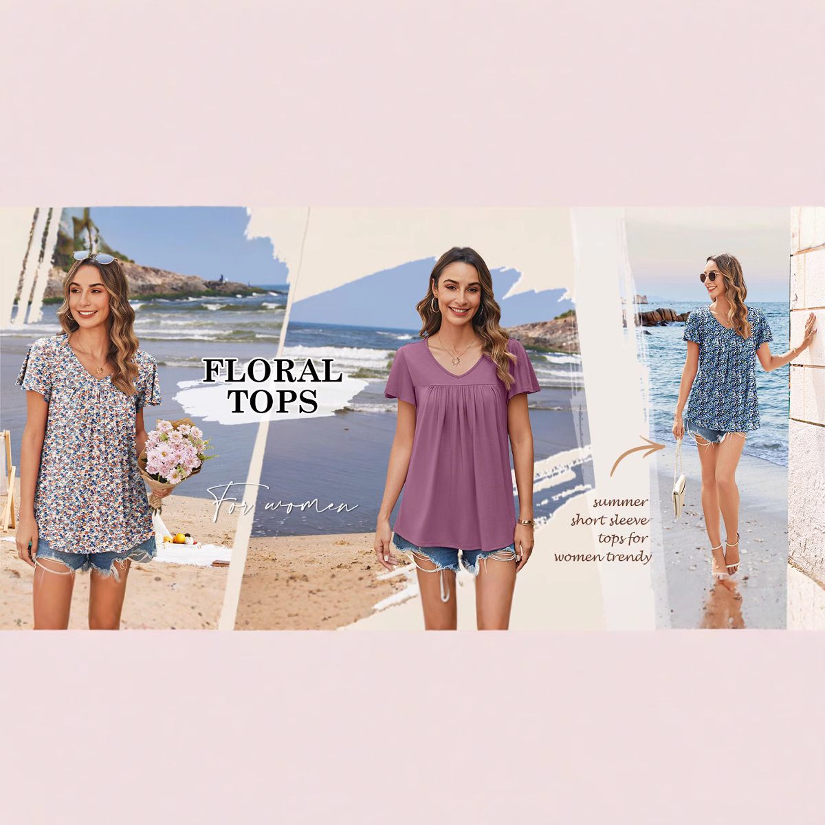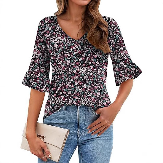 2024欧美跨境亚马逊夏季新品女式上衣 V领褶皱七分袖印花宽松衬衫