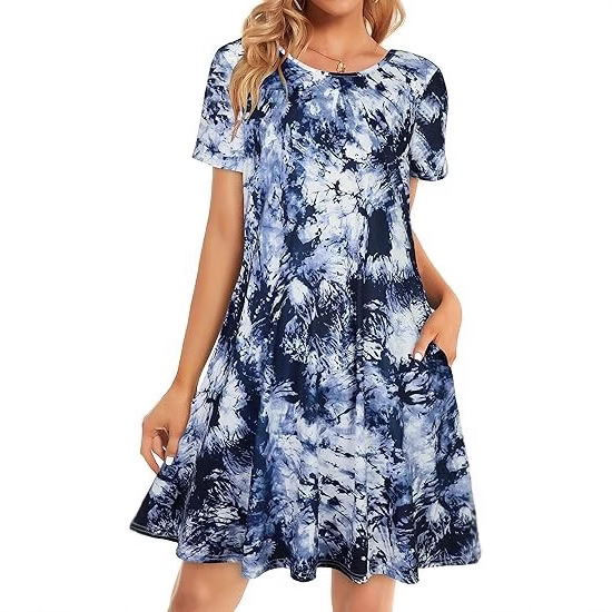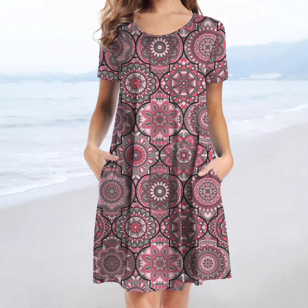 欧美印花女式夏季连衣裙沙滩休闲宽松 T 恤花卉短袖飘逸口袋背心