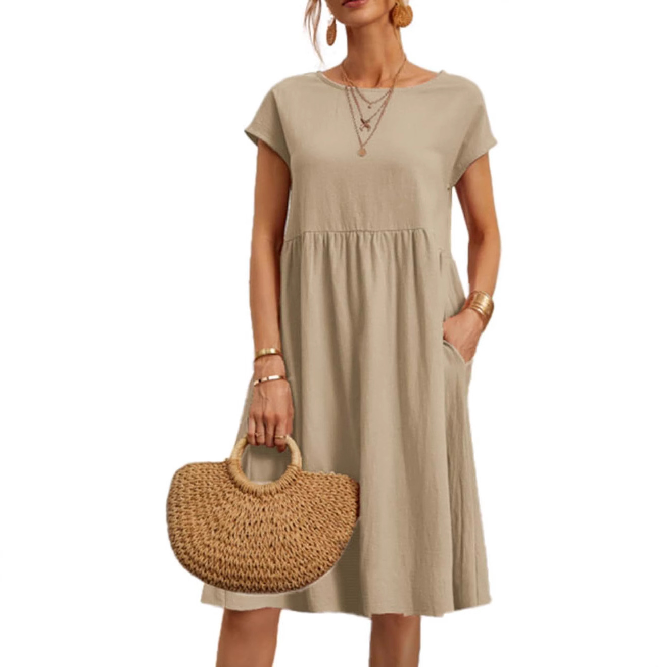 夏季女式连衣裙带宽松口袋2024中短袖棉质连衣裙长款衬衫连衣裙休