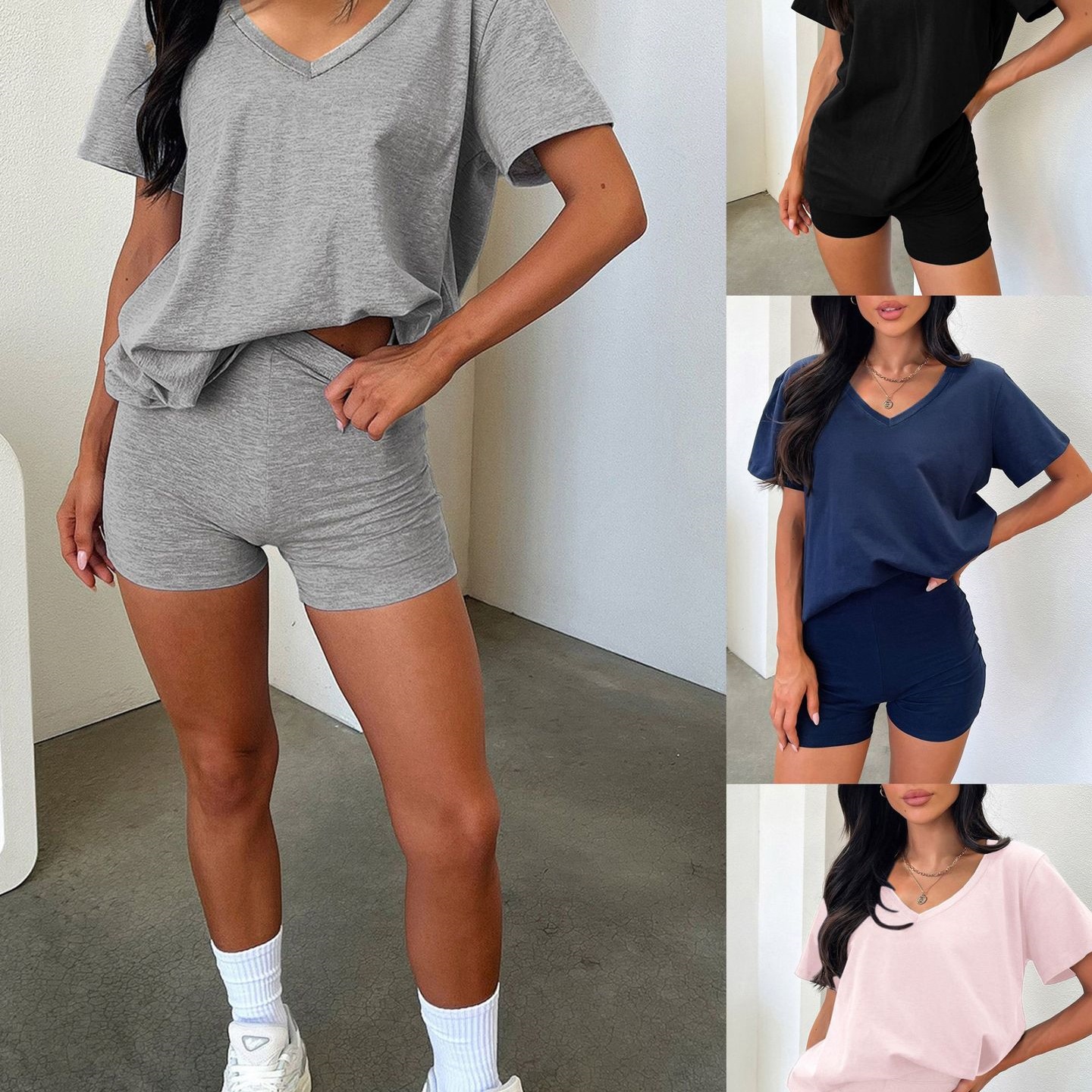 欧美 独立站 速卖通2025短袖春夏新款V领休闲气质纯色时尚套装女