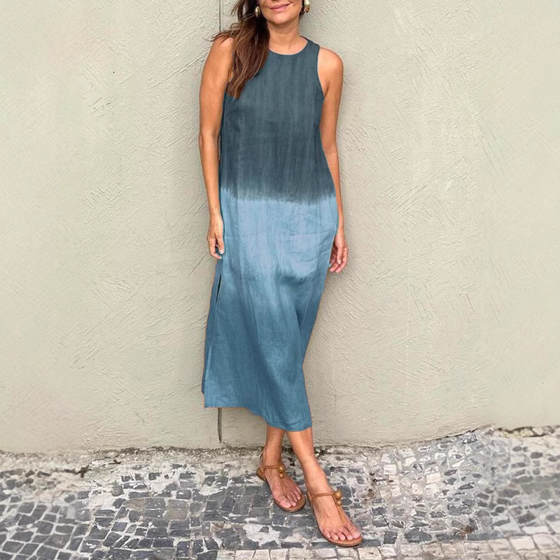 渐变色速卖通无袖亚马逊2024跨境女装夏季长款连衣裙开衩女式休闲