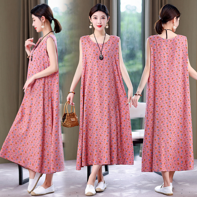 女欧美跨境亚马孙长款连衣裙速卖通无袖花卉印花口袋长裙