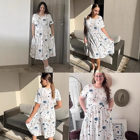 女式加大码夏季连衣裙短袖休闲迷你连衣裙高腰 T 恤连衣裙带口袋