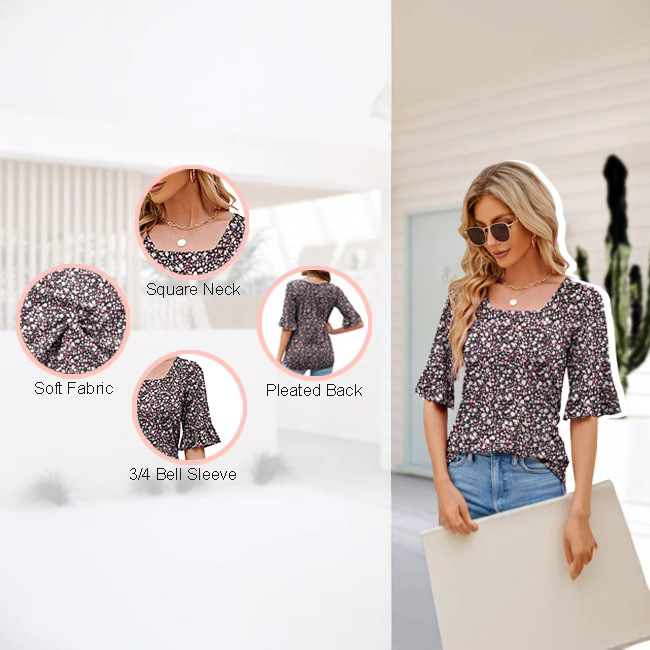 2024亚马逊夏季女式休闲七分袖上衣夏季方领 T 恤休闲荷叶袖印花