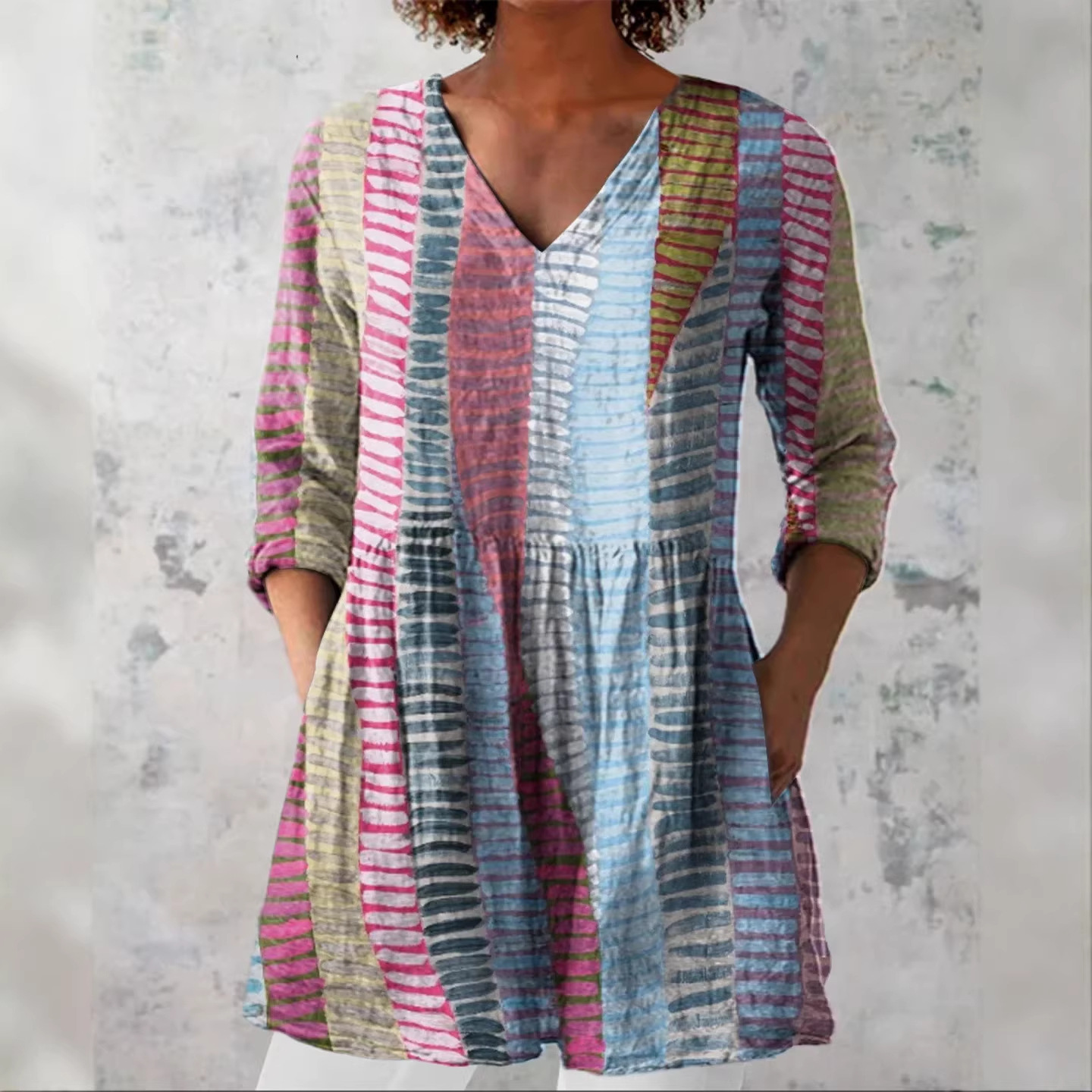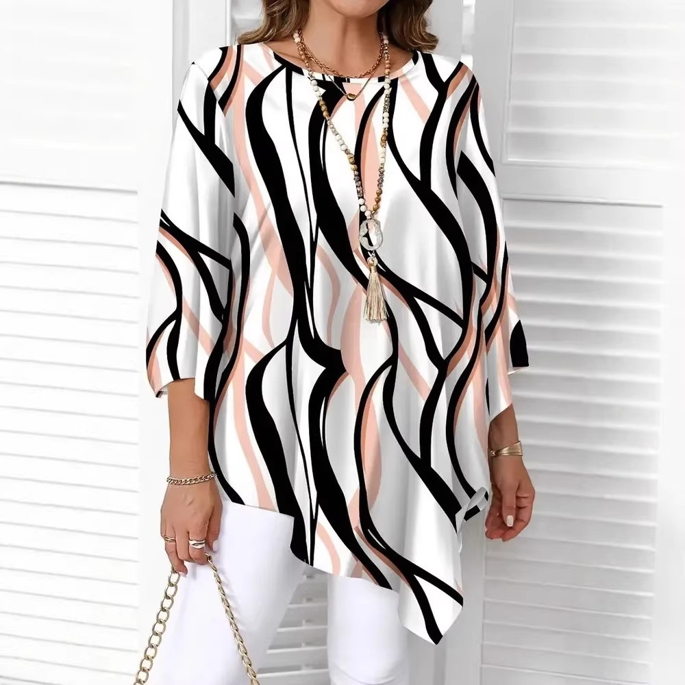 圣淼个性撞色波浪条纹上衣 圆领九分袖不规则下摆宽松休闲显瘦T恤