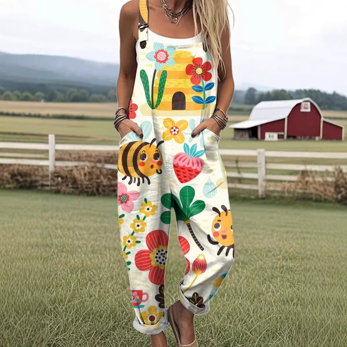 圣淼26跨境新款女装亚马逊欧美夏季数码3D印花扣子背带裤-竹节麻