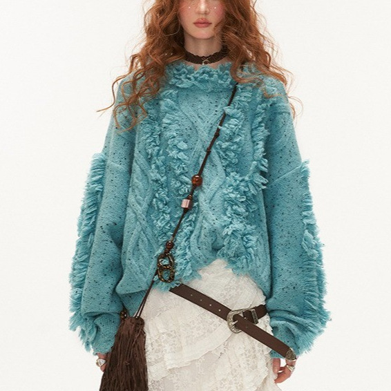 漏肩破坏流苏毛衣女款2024慵懒高级感秋季新款宽松针织衫上衣
