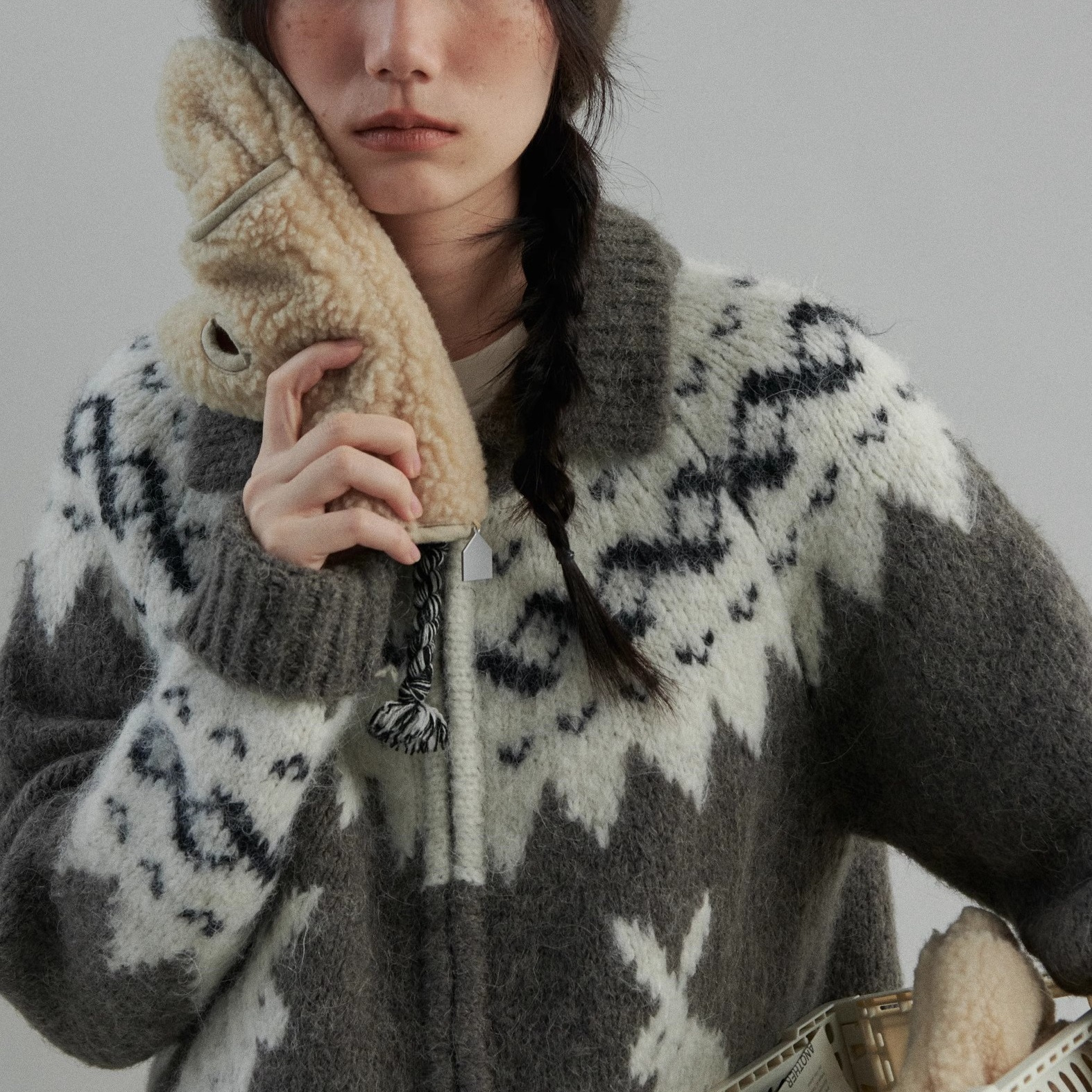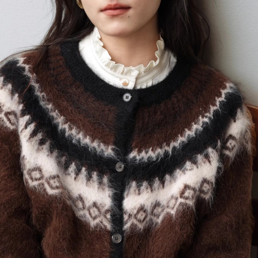 柔雾朦胧绒感摩天轮费尔岛羊驼毛兔子提花翻领开衫
