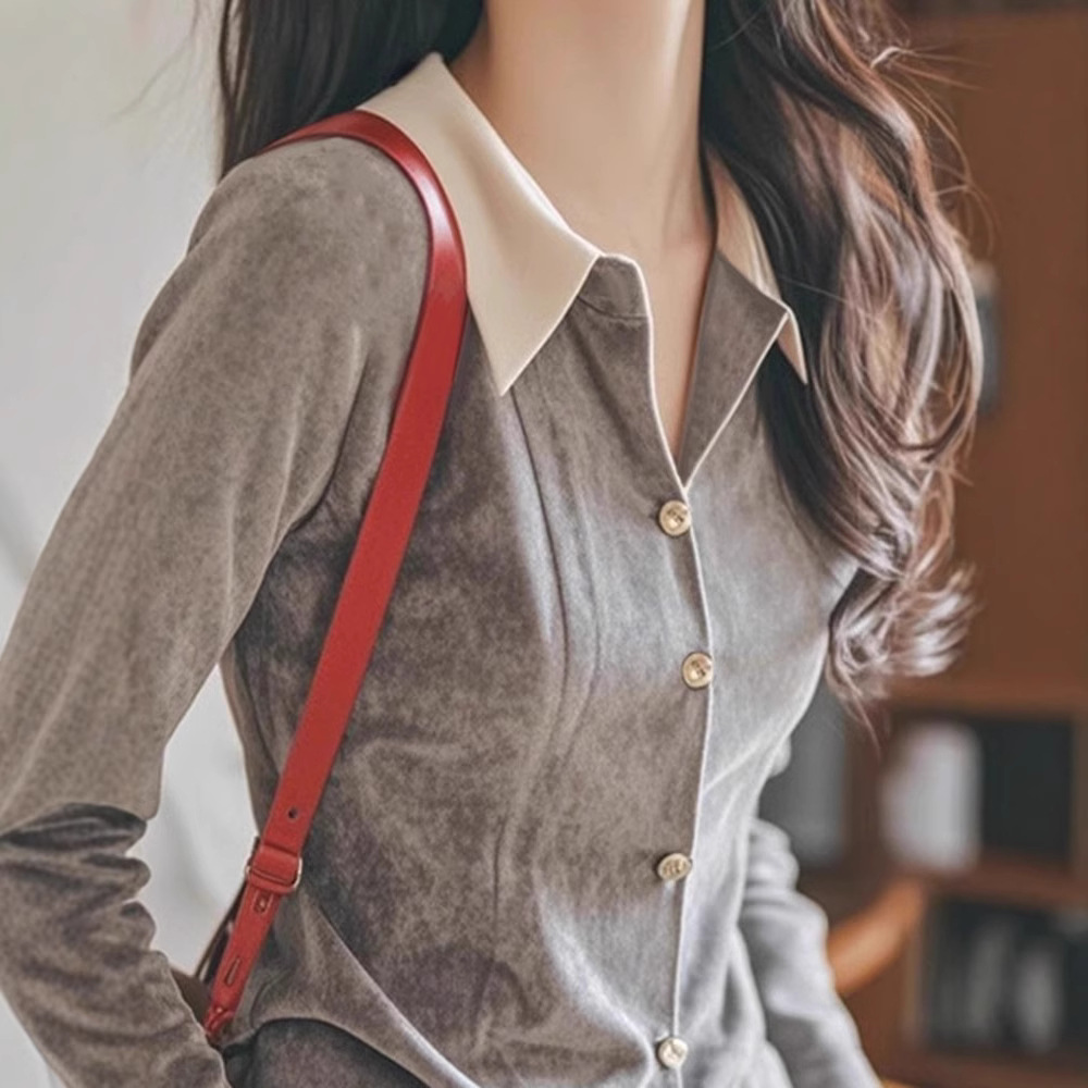 小柿子今年流行独特别致洋气减龄上衣轻熟法式灰色丝绒衬衫秋季