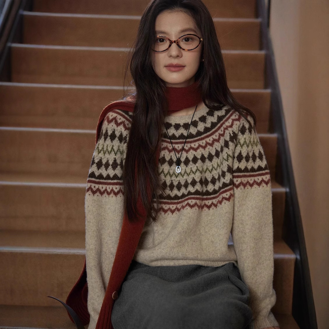 solighter法式复古羊毛费尔岛提花圆领毛衣女秋冬