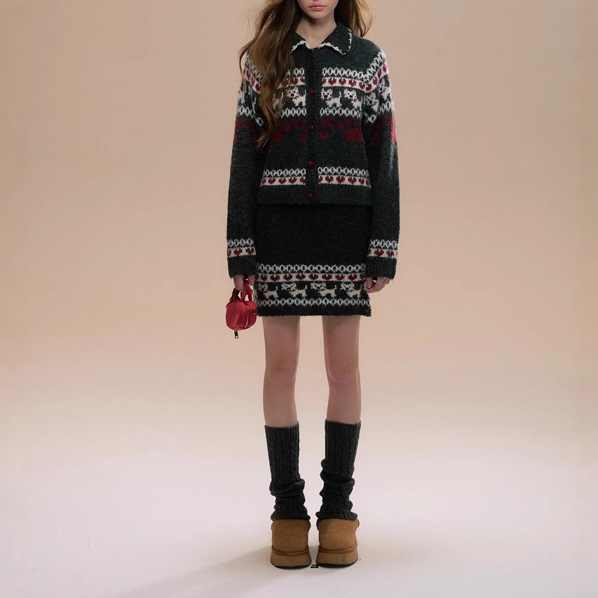日落公园 "小狗费尔岛"深灰色复古针织毛衣外套半裙冬
