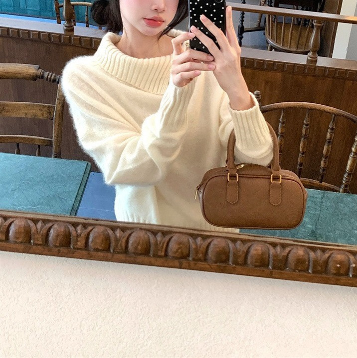 现货温柔风软糯针织衫女秋冬斜襟设计感小众内搭保暖白色高领毛衣