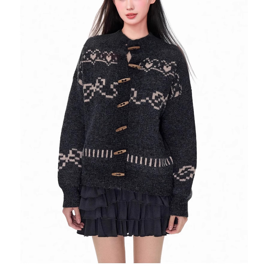 灰色费尔岛牛角扣毛衣外套女秋冬季宽松加厚针织开衫短款长袖上衣