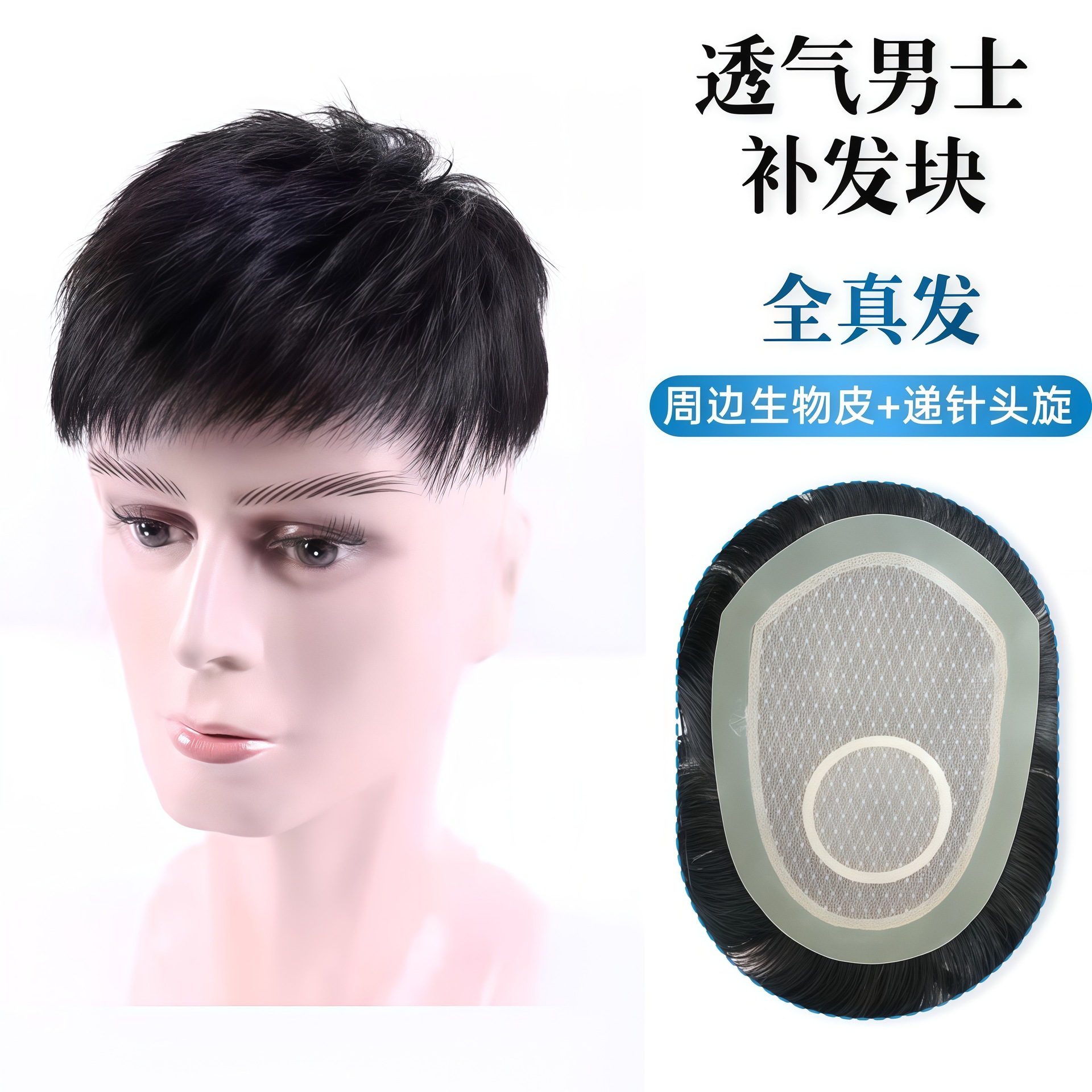 全手织补发块生物头皮手勾假发递针旋全真发隐形无痕遮白短发批发
