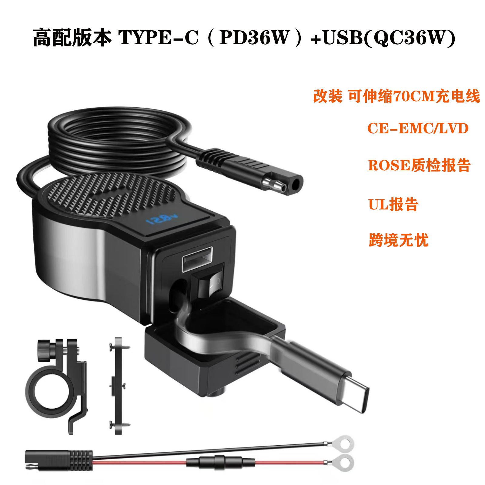 摩托车多功能龙头款车载手机USB可伸缩线数显PD快充充电器12-24V