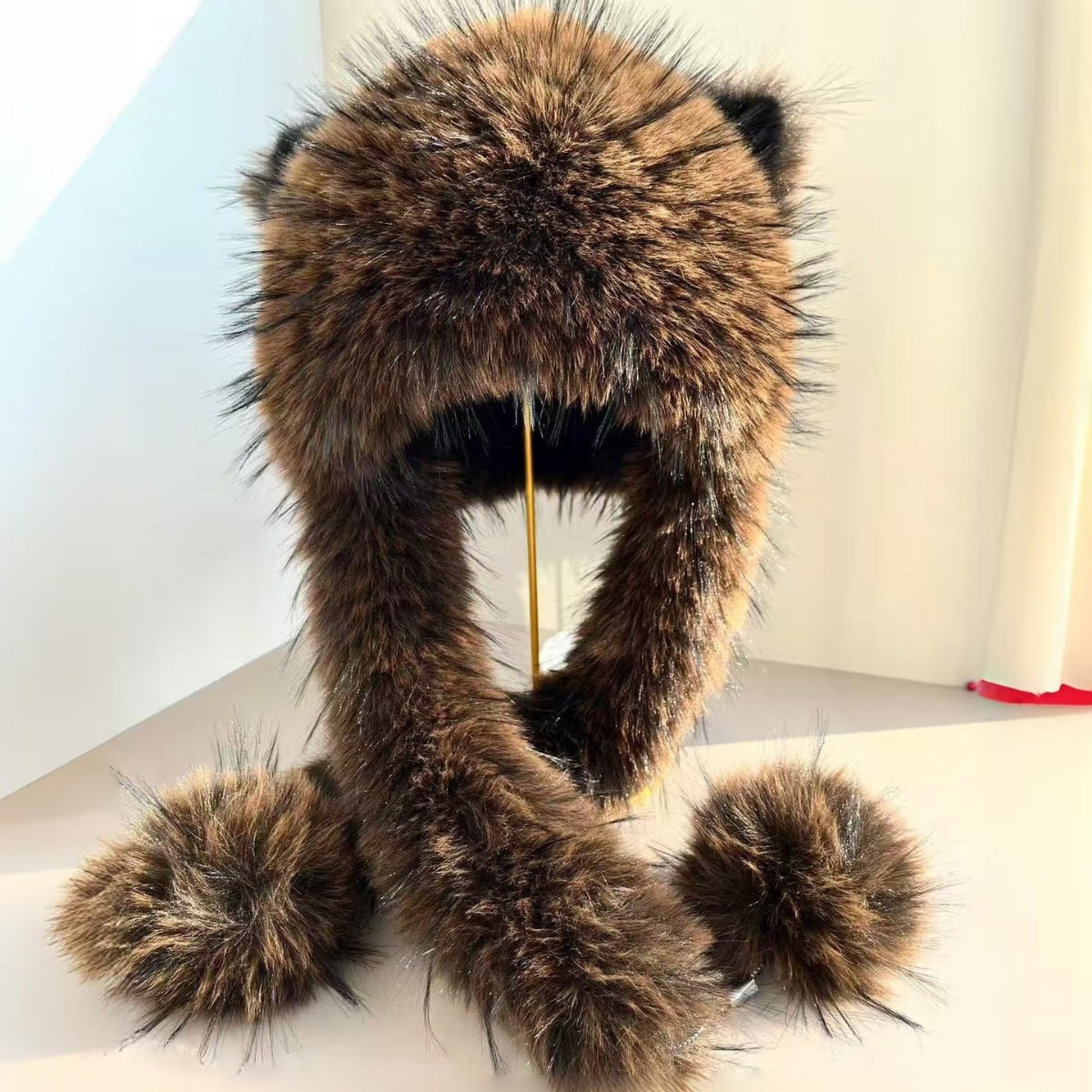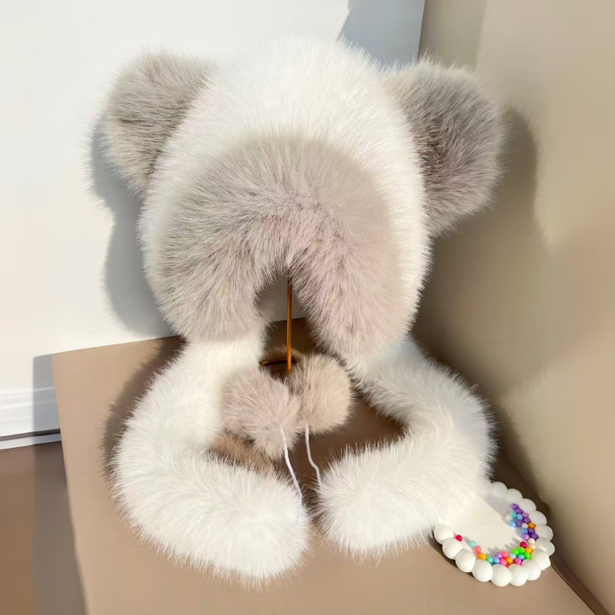 特厚抗寒款毛绒帽子冬季新款户外防寒保暖帽子围脖一体小熊帽子女