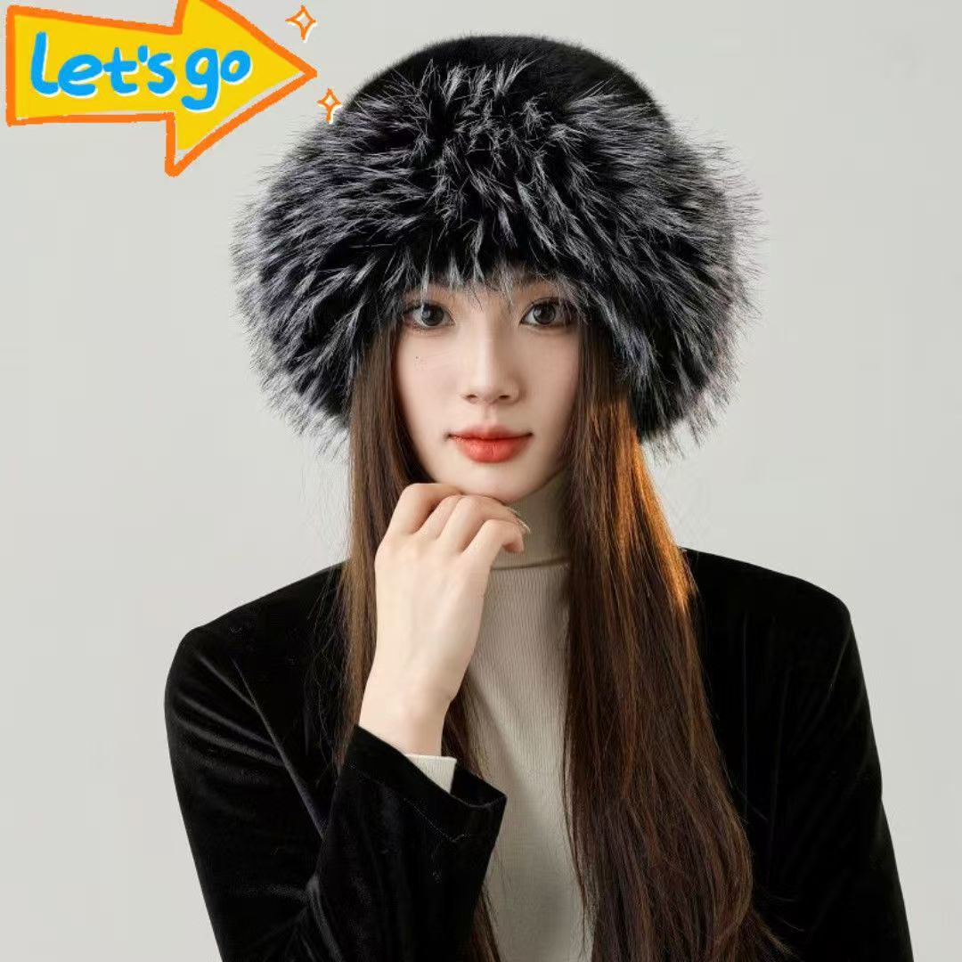 2025新款平顶帽女仿狐狸毛盆帽冬季户外防风保暖护耳水桶毛绒帽子