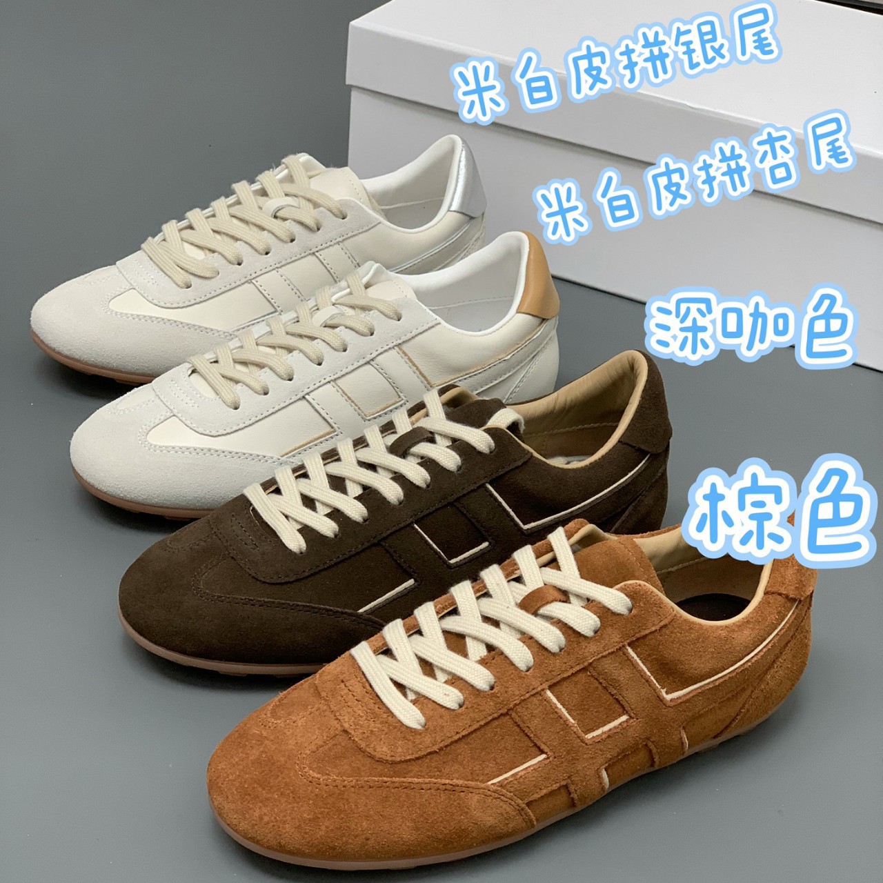 牛皮平底休闲徳训鞋~拼色系带休闲鞋 时尚百搭防滑大底