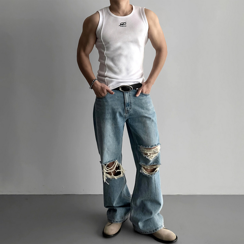 无袖t恤男夏季宽松坎肩男士背心潮牌ins韩版休闲洗水做旧纯色上衣