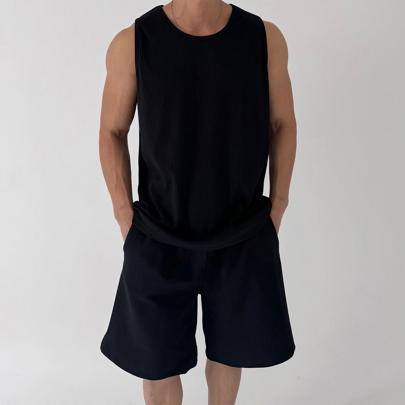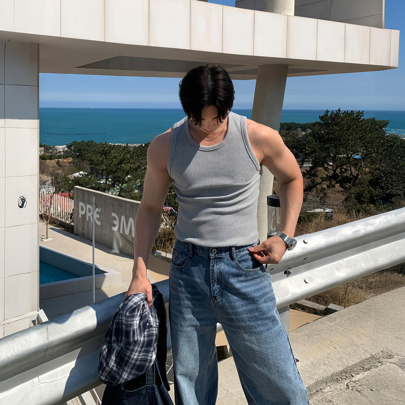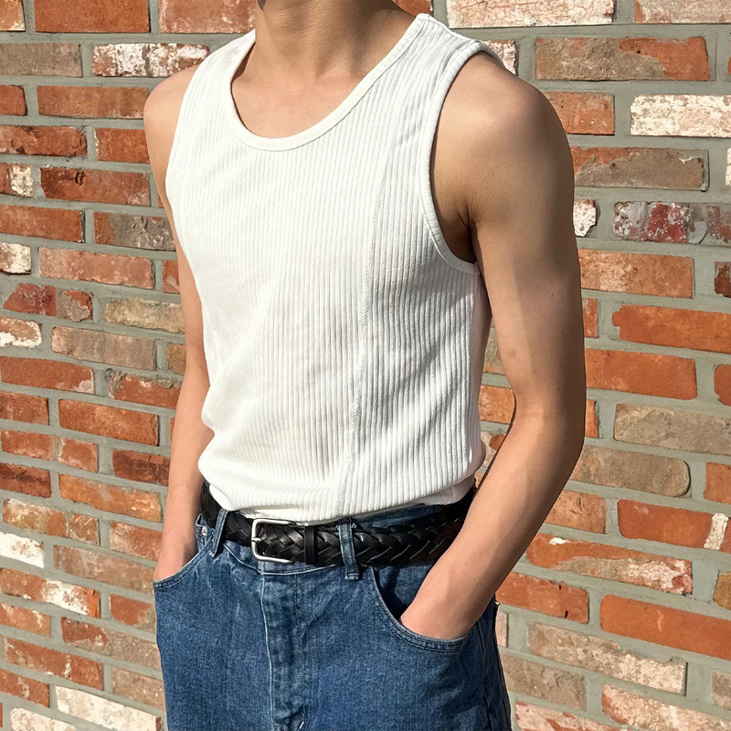 圆领螺纹背心男士夏季轻量级韩国竖条纹纹理无袖t恤紧弹力底衬衫